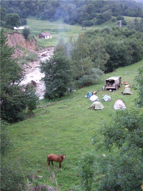 5-ый день. Утром встала рано, где-то в 6.15. Вылезла из палатки и вижу, джигиты, которые пасут лошадей, спят как хорьки. Одни у костра (Мага и Аслан), другие, напротив, под деревьями (Далхат и Мурик). А лошадей нет, стоят только те, которые привязаны. Я к одним подошла, позвала. В ответ только храп, подошла к другим, тоже самое. Ну пойду, поищу, а сама думаю куда они могли уйти. В лес вряд ли, там травы нет, назад по дороге, че там делать, пошла по дороге вперед, присмотрелась следы есть, значит, думаю, иду правильно. Перешла через мостик, лошадей нет, поднялась не много в гору, смотрю, стоят, пасутся. Давай назад потихоньку гнать, пригнала, смотрю, Жемчуг порвал веревку и бегает. Тут я подумала, ловить не буду. Подошла к Аслану, разбудила, говорю, Жемчуг веревку порвал, бегает, на что он толкает Магу и передает эти слова ему. Тот что-то пробормотал и дальше спать. Аслан сонный встал, взял уздечку, протянул мне и попросил поймать, а сам дальше дрыхнуть. Я помучалась минут 30 и перестала бегать. Думаю, потом сами поймают.
